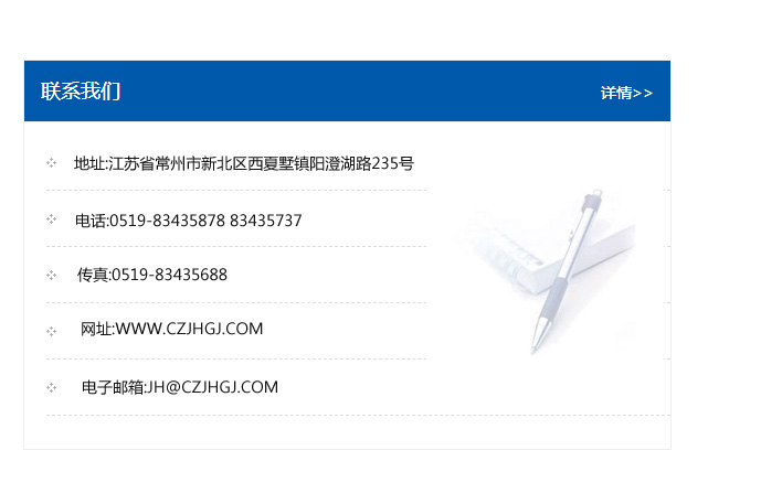 地址:常州市新北區友邦商務大廈1幢16、17層  電話:0519-85101652  傳真:0519-85112595  郵編:213022  網址:www.cz-jiayue_cn.zjlfyc.com  郵箱:xiajifengaa@163.com